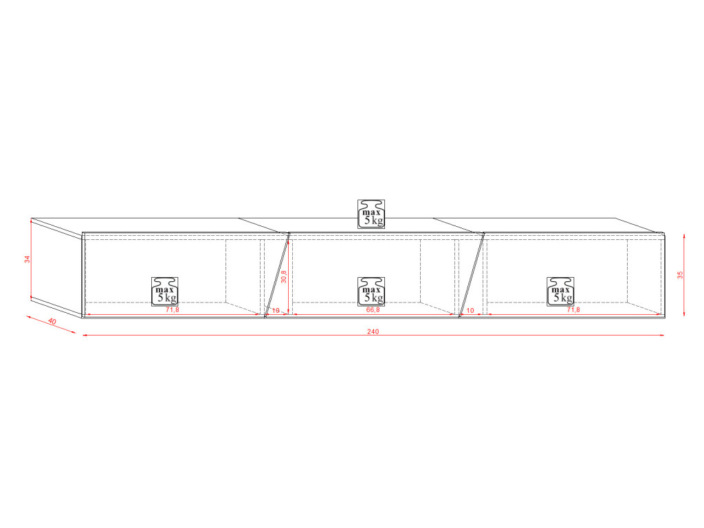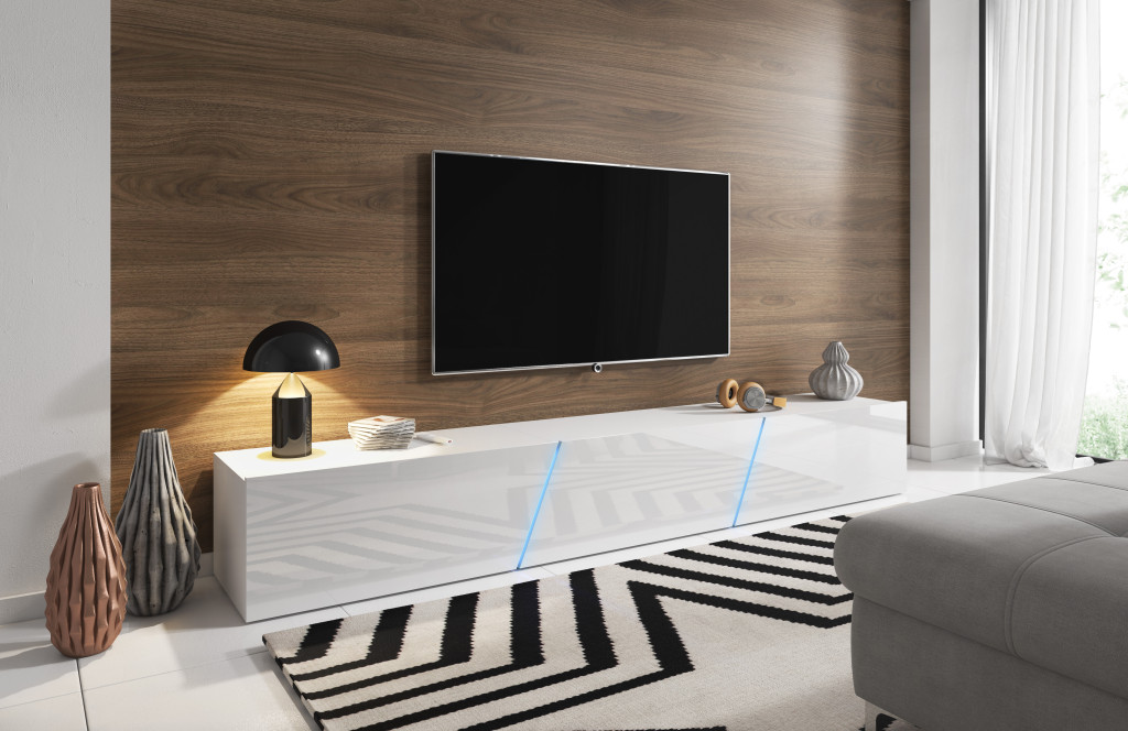 TV szekrény 240 cm fehér / fehér magasfény színkombinációban RGB LED világítással – SLANT