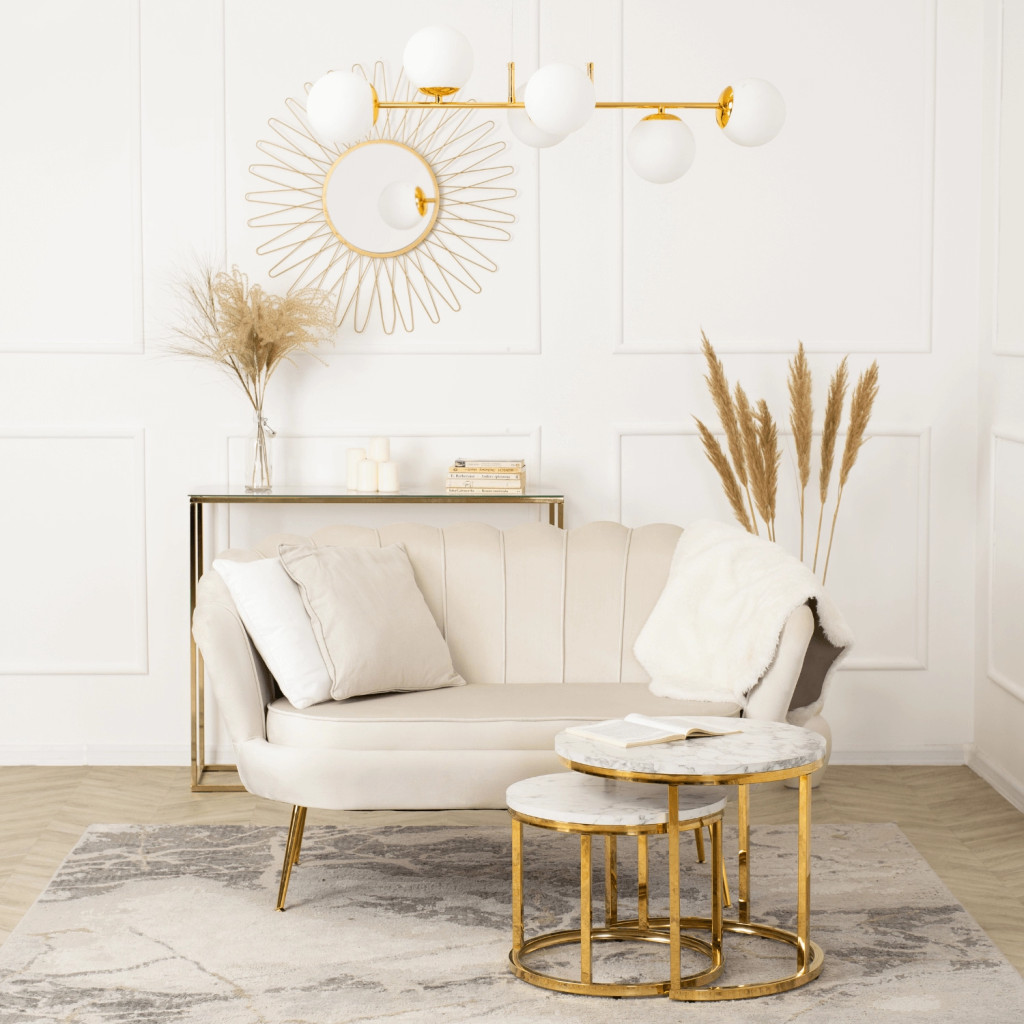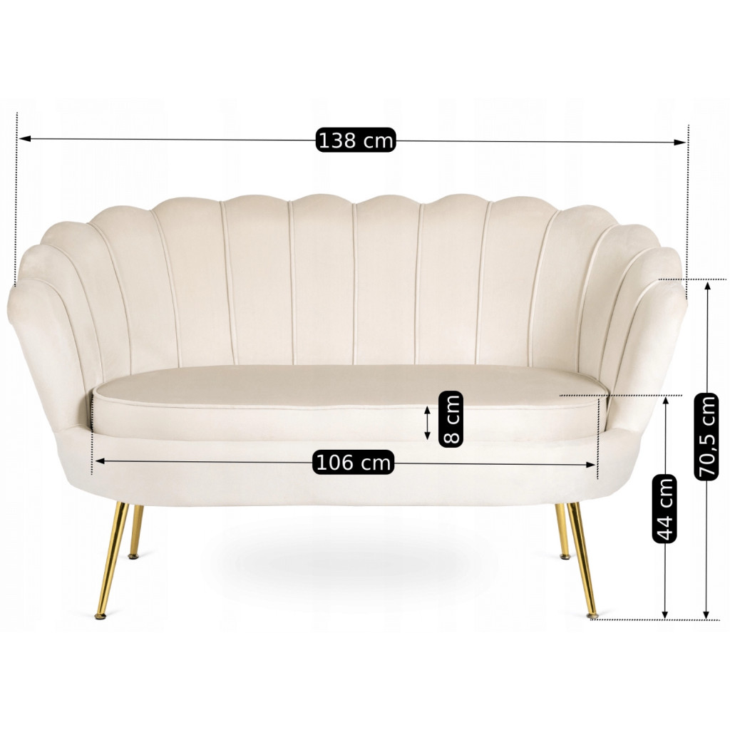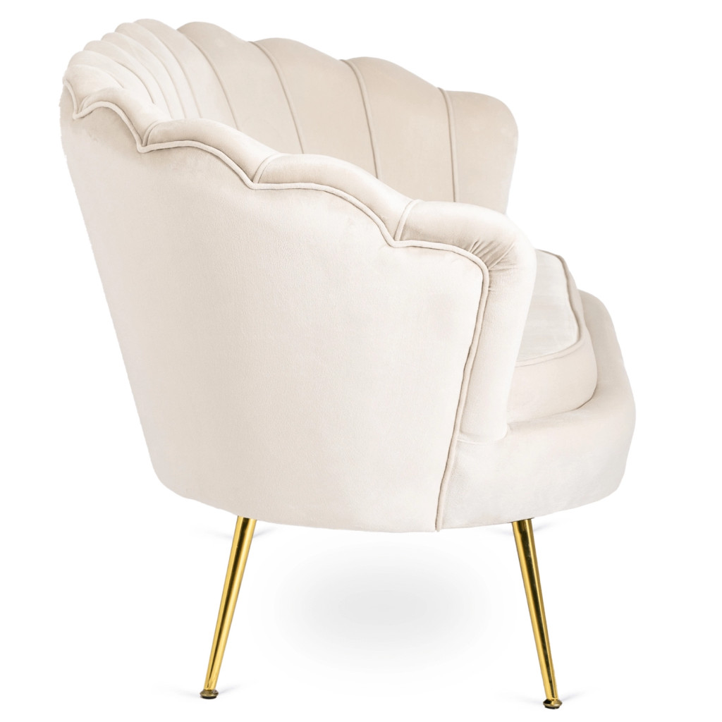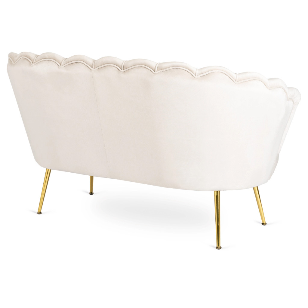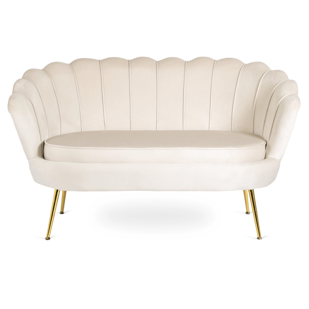 Glamour stílusú kétszemélyes bársony kanapé ikonikus kagylóhéj formájú háttámlával és arany fémszárral – elegáns, időtálló darab a nappaliba. A ZENDAYA krémszín bársony kárpitozása meleg, luxus atmoszférát teremt. Méret: 138x74x79 cm. Szállítás 14 munkanapon belül.