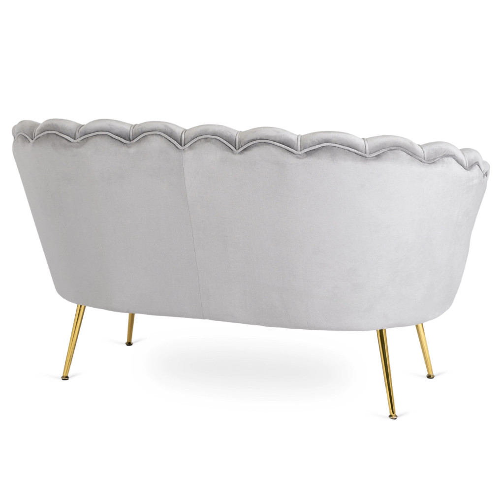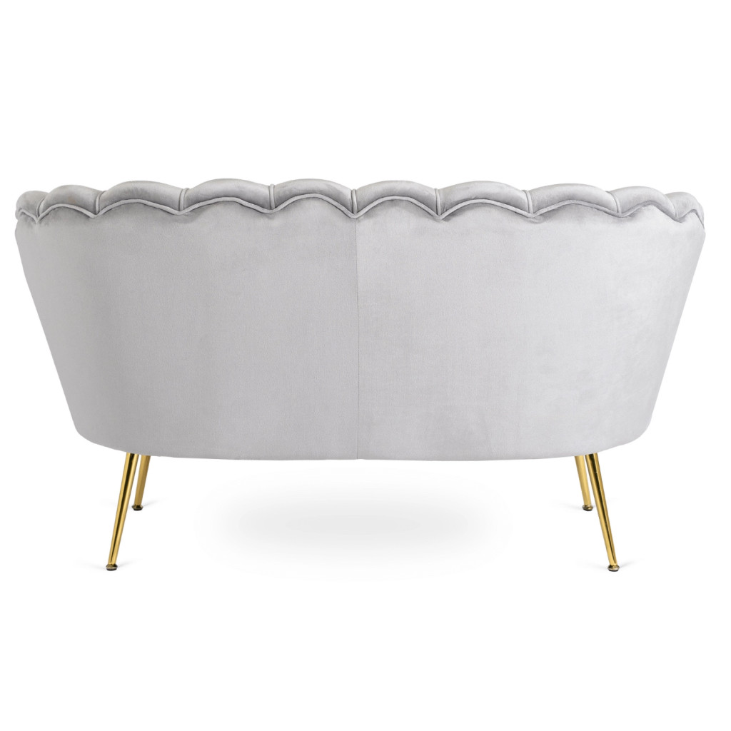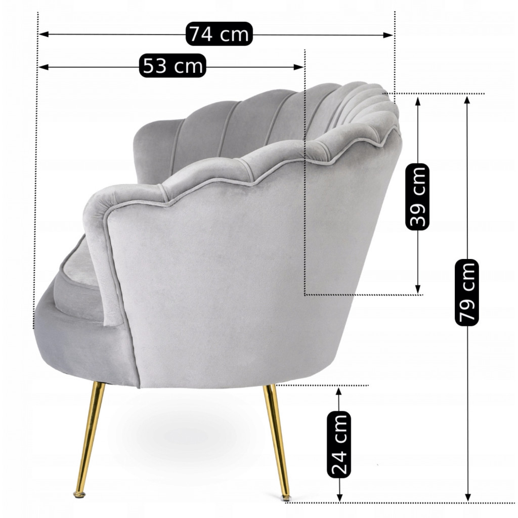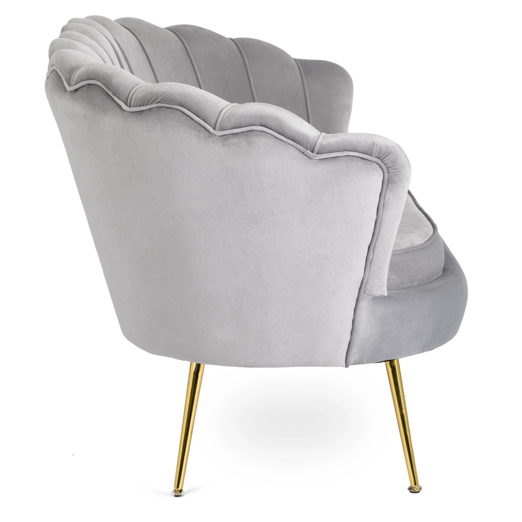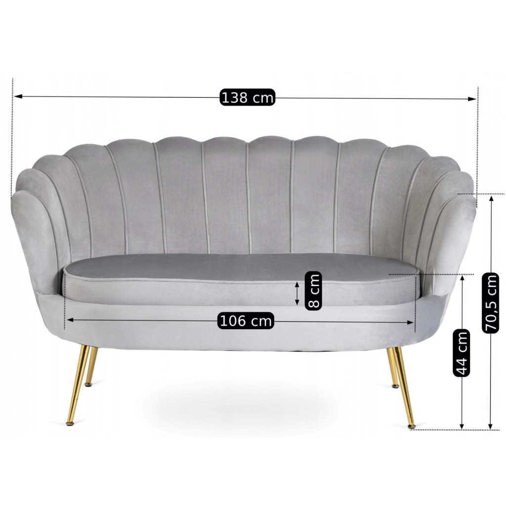 Glamour stílusú kétszemélyes bársony kanapé ikonikus kagylóhéj formájú háttámlával és arany fémszárral – kifinomult, modern darab a nappaliba. A ZENDAYA szürke bársony kárpitozása letisztult eleganciát kölcsönöz bármely enteriőrnek. Méret: 138x74x79 cm. Szállítás 14 munkanapon belül.