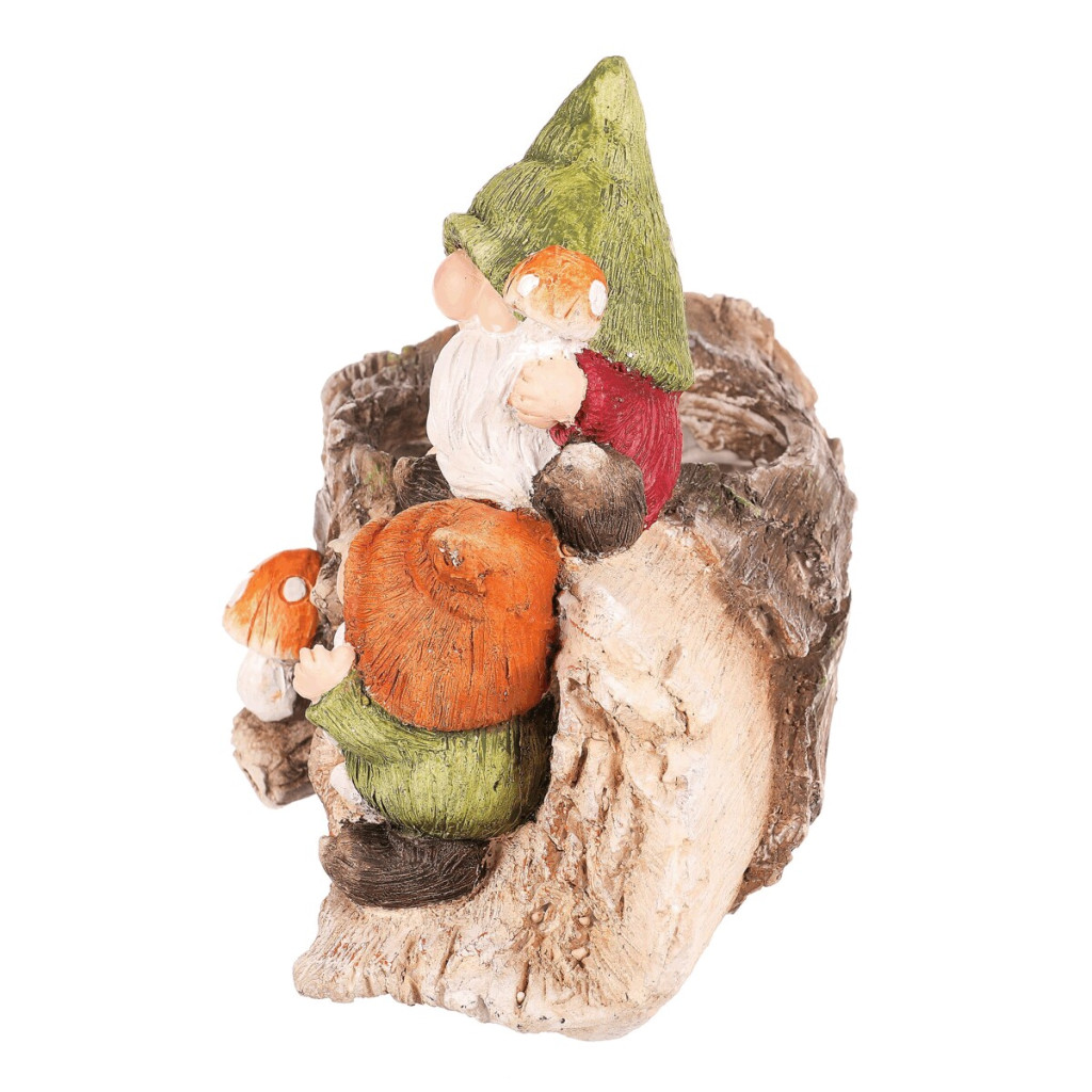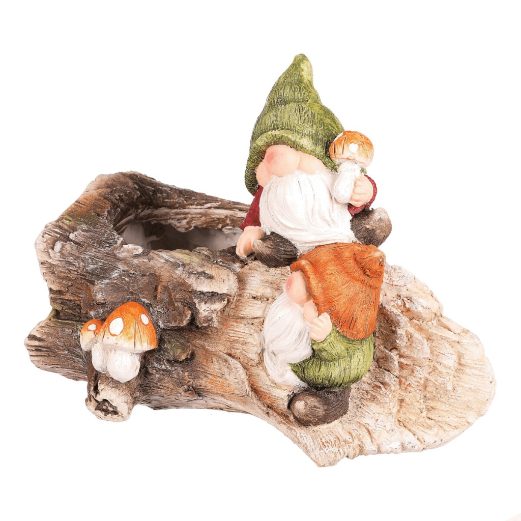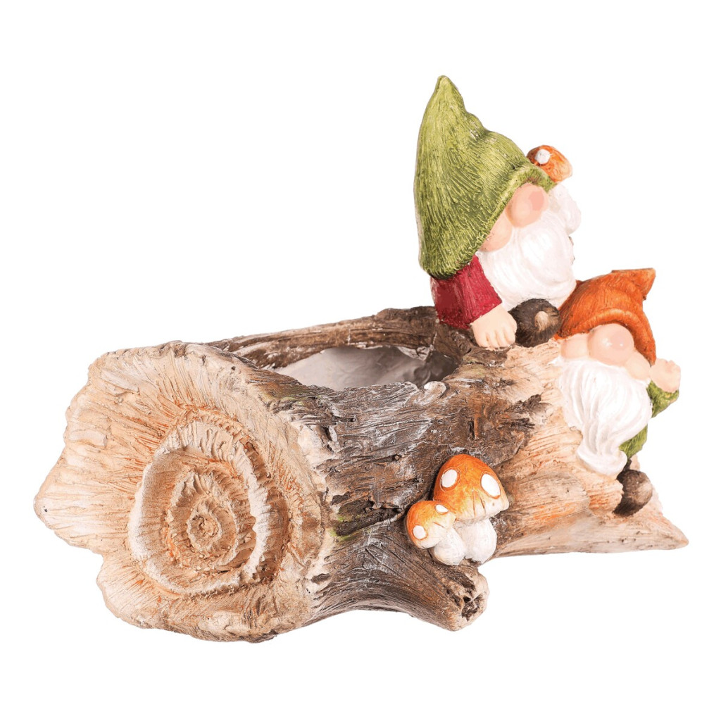 Kerti törpék fatönkön, magnézium dekoráció és virágtartó