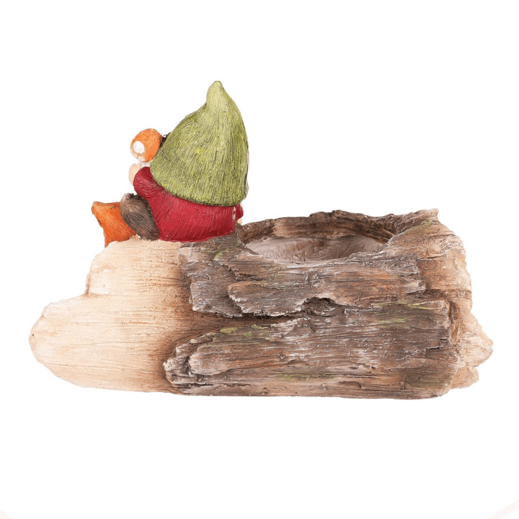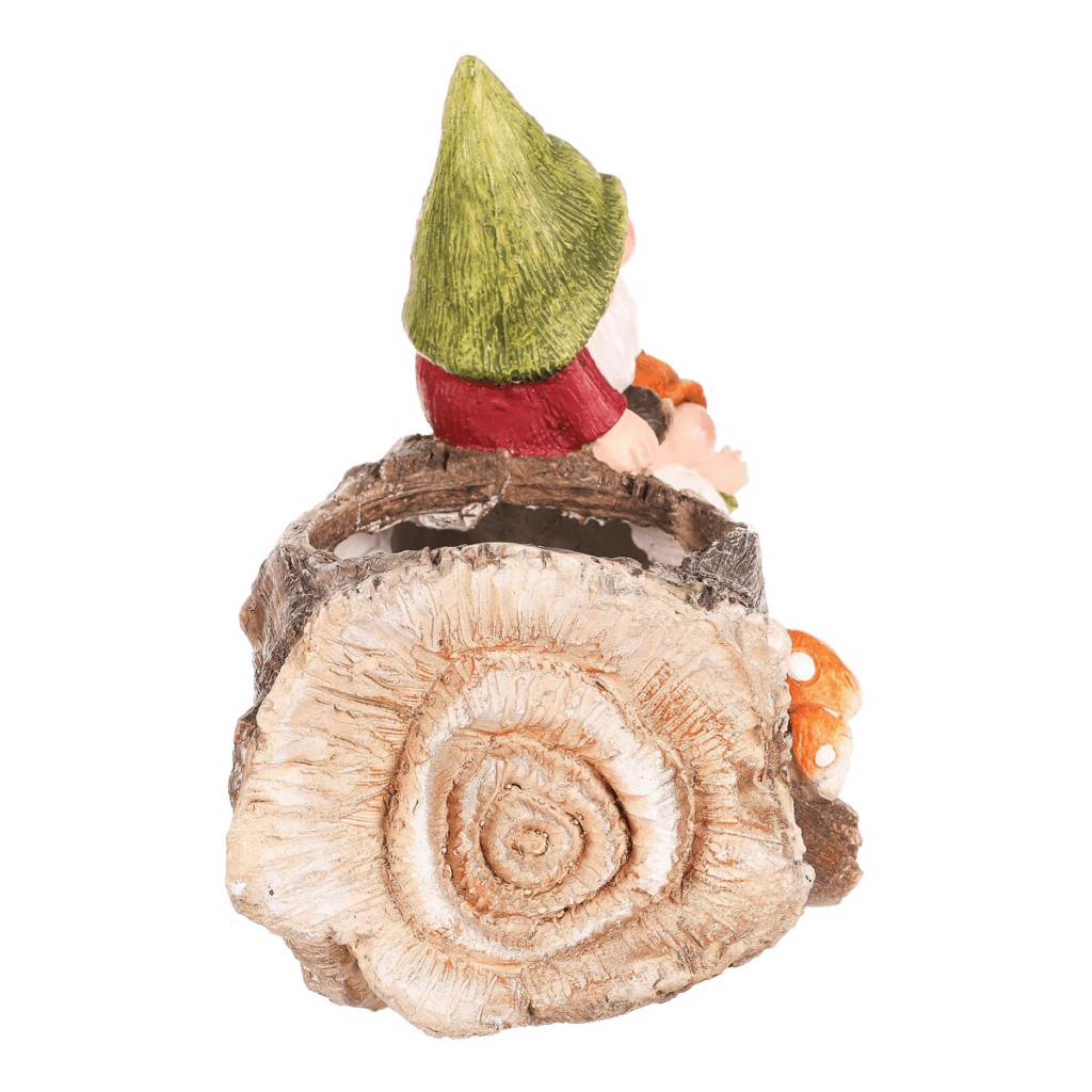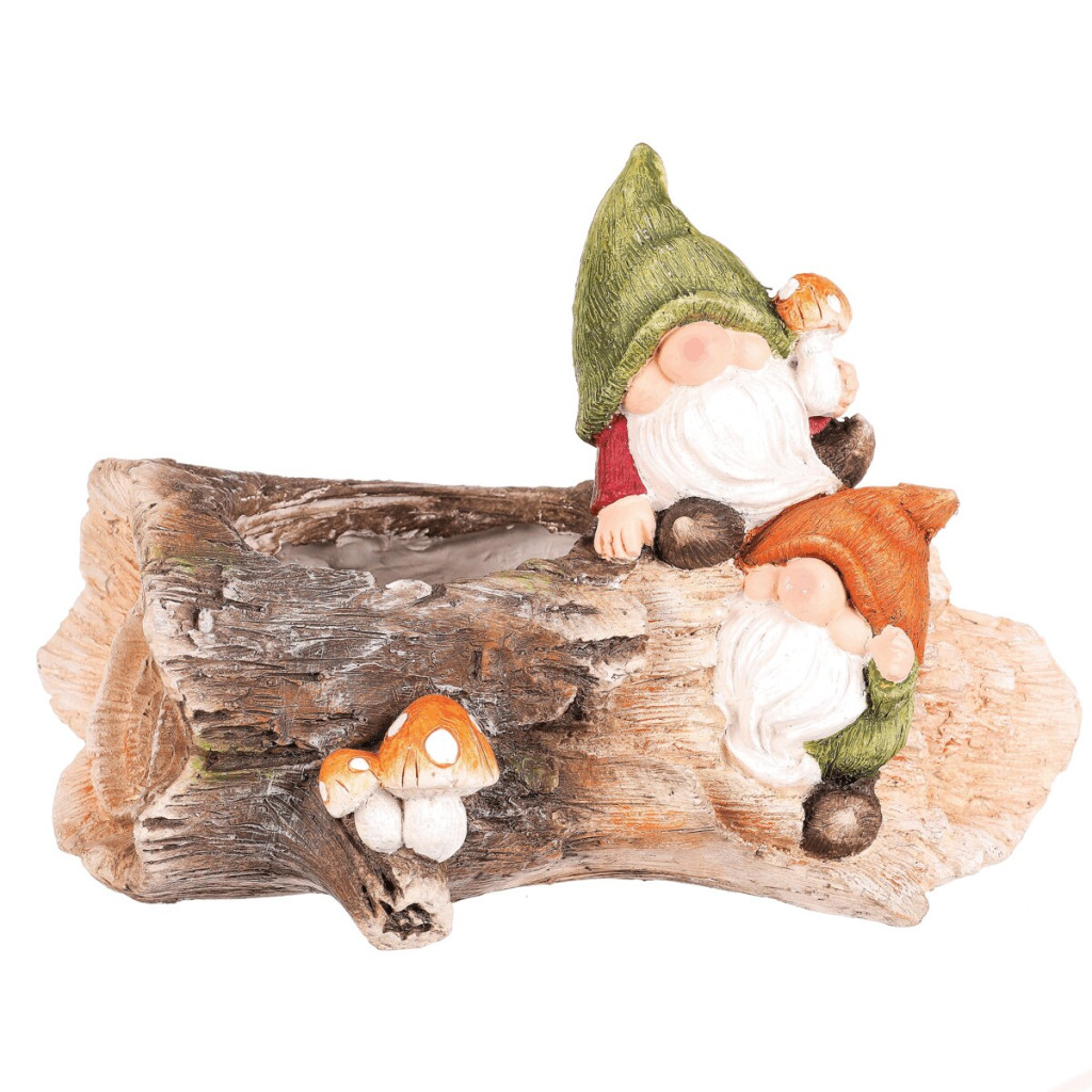Kerti törpék fatönkön, magnézium dekoráció és virágtartó